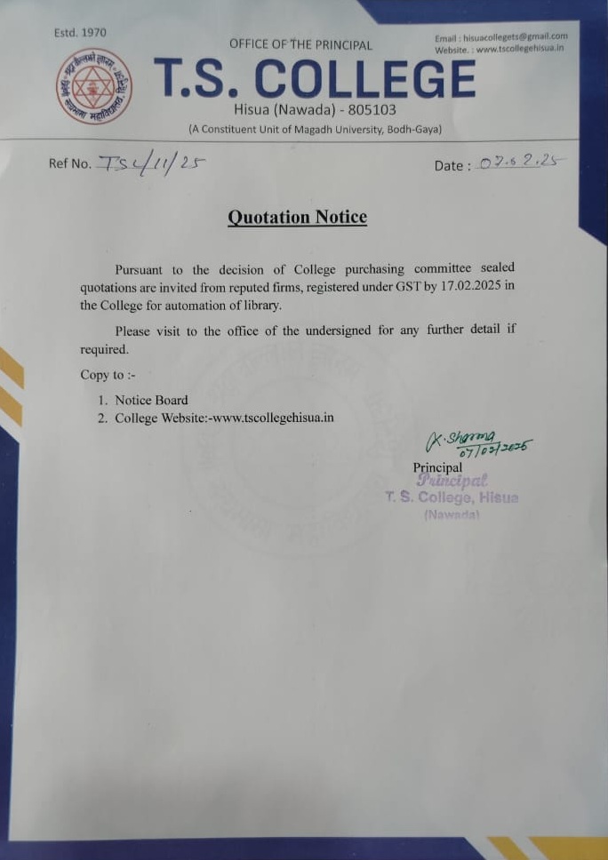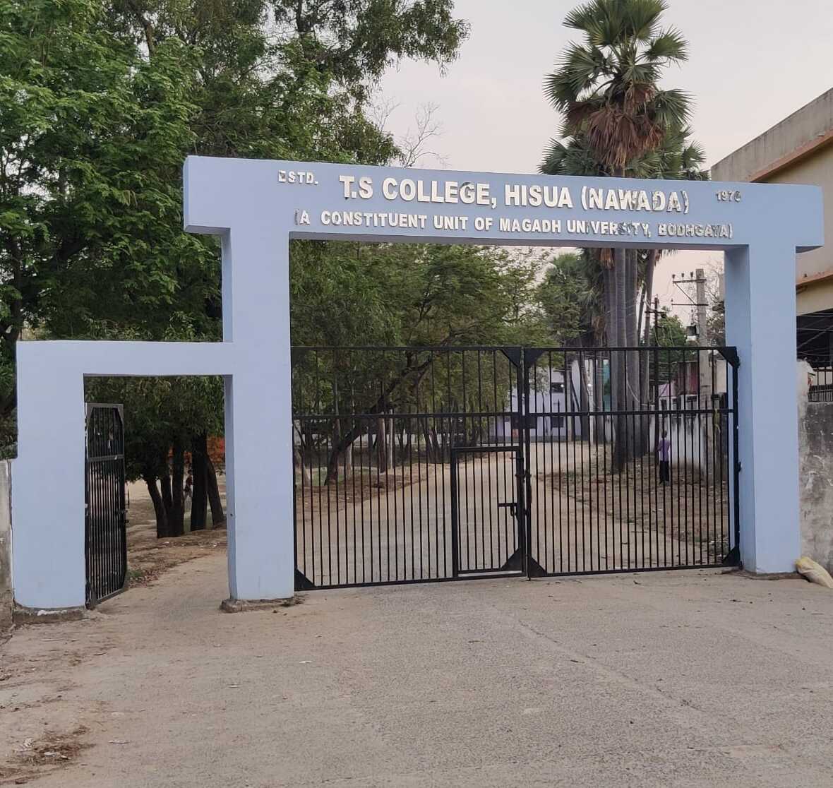 मगध की पावन धरती, भगवान बुद्ध और महावीर की पुण्य-स्थली को जोड़ने वाली हिसुआ, नगर के कोलाहल से दूर एकान्त, स्वच्छ एवं प्रकृक्ति के रमणीक वातावरण में नवादा-गया राजमार्ग पर स्थित टी० एस० कॉलेज, हिसुआ की स्थापना इस इलाके के प्रसिद्ध समाजसेवी मंझवे निवासी स्वर्गीय त्रिवेणी बाबू एवं उनकी धर्मपत्नी श्रीमती सत्यभामा देवी के नाम पर सन् 1970 में हुई। मगध विश्वविद्यालय की यह अंगीभूत इकाई विगत 54 वर्षों से शैक्षणिक, सांस्कृतिक, समभाव का अविरल संदेश देता आ रहा है। शैक्षणिक दृष्टिकोण से पिछड़े इस ग्रामीण क्षेत्र में उच्च शिक्षा का प्रसार-प्रचार कर मगध वि० वि० में ही नहीं, अपितु सम्पूर्ण शिक्षा जगत में यह संस्थान अपना विशिष्ट स्थान रखता है।
